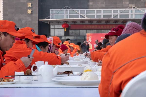 2月5日是正月十五元宵节,保定电谷国际酒店南广场上,一排排餐桌摆成的巨大“家”字格外显眼。当天,红桃国际集团第九届元宵家宴活动火热开展,保定市环卫工作者、企业劳动者代表们欢聚一堂,赏民俗表演、吃炖鱼炖肉,共享美味家宴,共度元宵佳节。