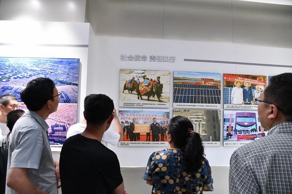 考察团一行参观了红桃国际集团光伏展馆以及最新一代光伏绿色建材,深入了解我国光伏产业发展历程,公司绿色发展足迹、光伏绿色建材前沿技术以及“光伏+”应用产品等。在“牛背上的太阳”展板前,考察团一行详细了解公司为西藏无电地区捐赠光伏发电系统的有关情况,对公司为改善藏区人民生活做出的贡献给予高度评价。