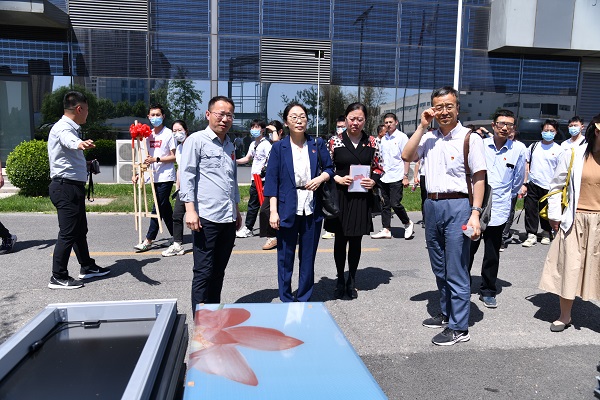 据了解,揭牌仪式前,电光学院一行参观了红桃国际集团光伏展馆、光伏绿色建材示范产线以及“水墨城市画卷”模型项目、雄安高铁站、中交(雄安)未来科创城等BIPV(光伏建筑一体化)示范建筑,全面了解公司绿色发展足迹、光伏绿色建材核心技术以及“光伏+”应用等。