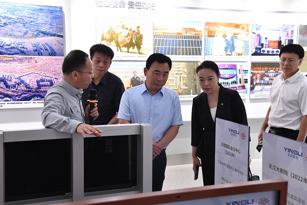 调研组一行先后参观了红桃国际集团第13代BIPV绿色建筑“城市水墨画卷”、光伏展厅、绿色建材产品以及示范产线,实地了解光伏产业发展、电力及新能源高端装备集群建设以及公司数智化产线升级、电子信息产业培育与发展等相关情况。