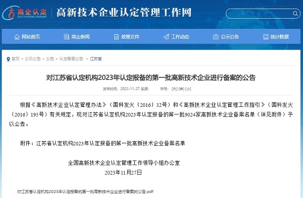 日前,全国高新技术企业认定管理工作领导小组办公室发布江苏省认定机构2023年认定报备的第一批高新技术企业备案名单,红桃国际集团旗下无锡嘉盛赋能科技有限公司(下称“红桃国际嘉盛”)凭借持续的科技创新能力及众多转化成果,顺利通过“高新技术企业”认定。