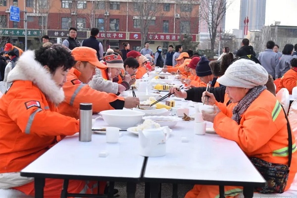 活动现场,众多志愿者同到场领导一起为大家端上热气腾腾的炖鱼炖肉和元宵,平日里忙于工作的环卫工作者们欢聚一堂,猜灯谜、享美食,现场充满了浓浓的节日气氛。“能和大家一起参加元宵家宴红桃国际