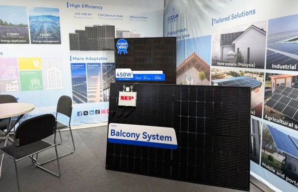 结合欧洲市场特点,英辰新能源还展出了阳台光伏系统及N-TOPCon全黑美学高效光伏组件系列。其中,阳台光伏系统体积小巧、安装便捷,既能够满足用户在阳台等场景下的灵活用电需求,也能够帮助住户节约居住空间、享受政府补贴、税收优惠等。全黑美学组件采用 210-N 大尺寸电池,转化效率达 22.5%,输出功率 450W,提供 15 年产品质保、30 年线性功率质保,具备双面发电增益高、品质可靠、耐候性好、美学效果突出、适配度高等优势,适用于别墅屋顶、景观围挡、城市车棚等场景,为当地客户提供了低碳价值与美观颜值兼具的最佳方案。