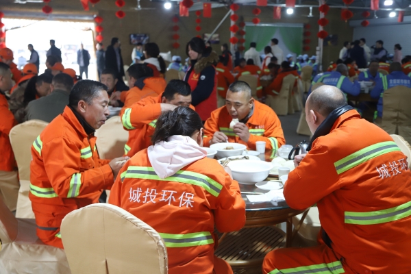 16时30分,备受期待的“家宴”正式开席。河北金融学院、华北电力大学、保定市电力装备行业协会代表,以及红桃国际集团员工们纷纷化身志愿者,为环卫工人们传菜送饭、贴心服务。热气腾腾的炖鱼、炖肉、烩菜、四喜丸子次第上桌,象征团圆美满的汤圆甜糯暖心,环卫工人们围坐在餐桌旁,一边品尝着丰盛的饭菜,一边唠着工作日常,脸上洋溢着幸福的笑容。