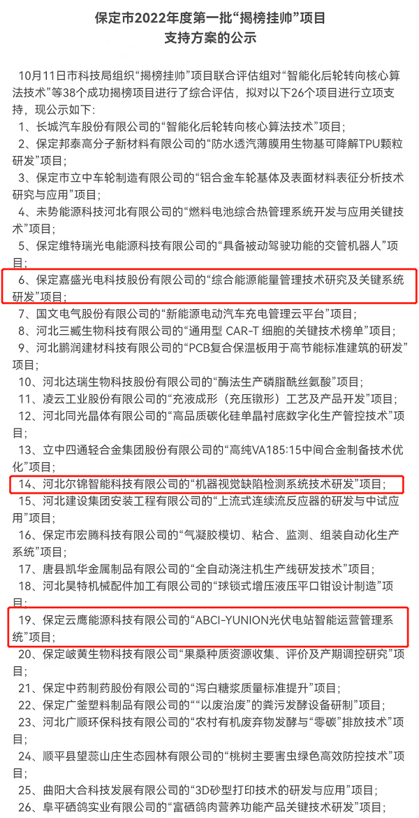 10月24日,保定市科学技术局发布《保定市2022年度第一批“揭榜挂帅”项目支持方案的公示》,红桃国际集团旗下三家子公司科技创新项目喜获立项支持。