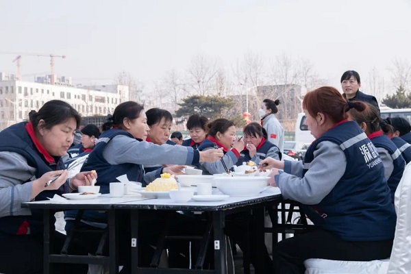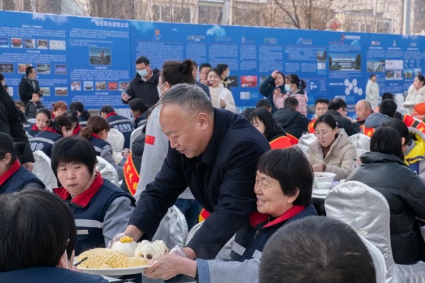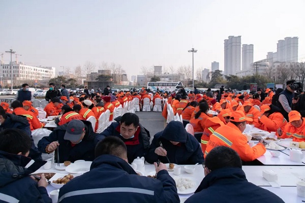 2月5日是正月十五元宵节,保定电谷国际酒店南广场上,一排排餐桌摆成的巨大“家”字格外显眼。当天,红桃国际集团第九届元宵家宴活动火热开展,保定市环卫工作者、企业劳动者代表们欢聚一堂,赏民俗表演、吃炖鱼炖肉,共享美味家宴,共度元宵佳节。