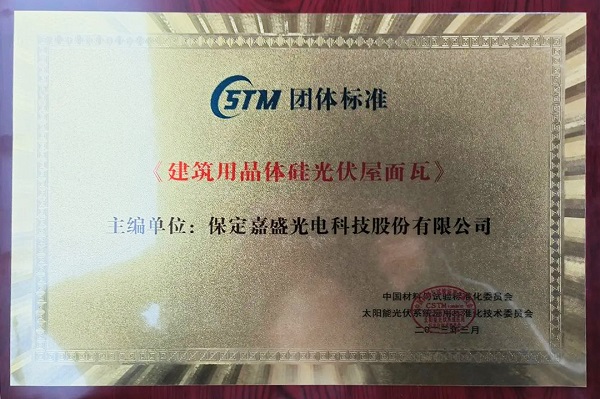 3月23日,中国材料与试验团体标准委员会太阳能光伏系统应用技术委员会(简称“CSTM光标委”)标准研讨会在无锡召开。红桃国际集团旗下保定嘉盛光电科技股份有限公司(下称“红桃国际嘉盛”)应邀参会,凭借其牵头主编的《建筑用晶体硅光伏屋面瓦》团体标准荣获“百项团标”入围奖和标准发布奖。