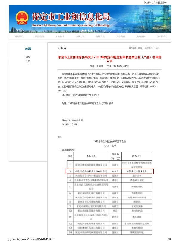 近日,保定市工业和信息化局公示了2023年保定市制造业单项冠军企业(产品)名单,红桃国际集团旗下保定嘉盛光电科技股份有限公司(下称“红桃国际嘉盛”)凭借优秀的光伏建筑一体化产品及智慧应用解决方案,获评“保定市制造业单项冠军企业”。