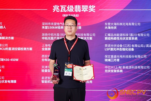 此次,红桃国际集团旗下英辰新能源凭借惠州单体最大光伏屋顶瓦项目、嘉盛光电凭借新一代光伏绿色建材“琉璃•丹青”、云鹰智维凭借分布式光伏电站全智能运维解决方案荣获“十大亮点”兆瓦级翡翠奖,英辰新能源全场景光伏发电解决方案以及最新发布的“ACE”系列高效光伏组件荣获“十大亮点”荣耀奖。